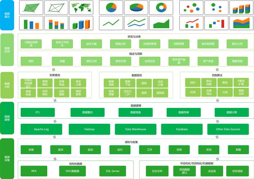 iDiscover是華軟自主開(kāi)發(fā)的基于機(jī)器人流程自動(dòng)化(RPA)、大數(shù)據(jù)(BIGDATA)和人工智能(AI)技術(shù)的智慧輔助系統(tǒng)??勺詣?dòng)感知、收集每臺(tái)設(shè)備上工具軟件的各類運(yùn)行數(shù)據(jù),并將這些數(shù)據(jù)導(dǎo)入融合了AI技術(shù)的數(shù)據(jù)模型,以可視化的形式幫助企業(yè)洞察關(guān)鍵軟件的需求分布、使用趨勢(shì)、授權(quán)負(fù)載以及各類用戶的行為偏好,并從升級(jí)淘汰、預(yù)算規(guī)劃、成本分?jǐn)?、人工時(shí)核算等多個(gè)方面為數(shù)字化的精益管理與運(yùn)營(yíng)提供決策輔助,以達(dá)成優(yōu)化資源配置與降本增效的目標(biāo),助力企業(yè)的數(shù)字化轉(zhuǎn)型。